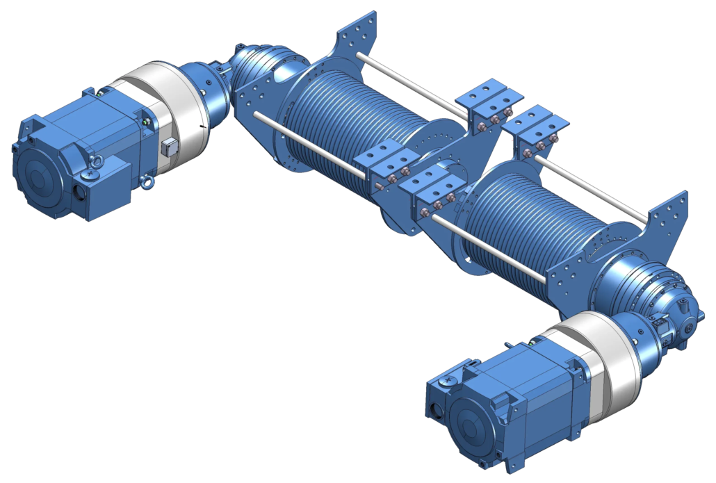 Am Fuß des Offshore-Schiffs befindet sich eine große Winde, die die gesamte Gangway auf die benötigte Höhe heben kann. Angetrieben von zwei Motoren, lässt sich die Gangway bis zu 15 Meter hochheben. Die Redundanz der beiden Motoren gewährleistet einen sicheren Betrieb. Bei Bedarf kann die Gangway auch mit nur einem Motor und geringerer Geschwindigkeit positioniert werden.